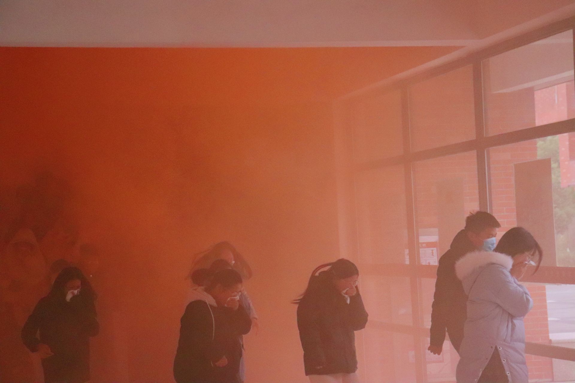 此次消防演练的主要内容是通过模拟火灾现场,指导师生在发生火灾后如何自救逃生。演练期间,师生用湿毛巾捂住口鼻,在引导员的指令下有序撤离“火灾现场”。通过学院前期精密部署,整场演练活动规范有序、紧凑高效。
