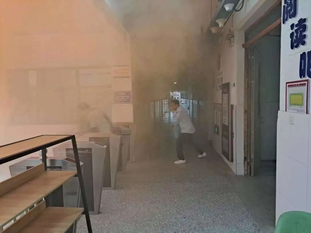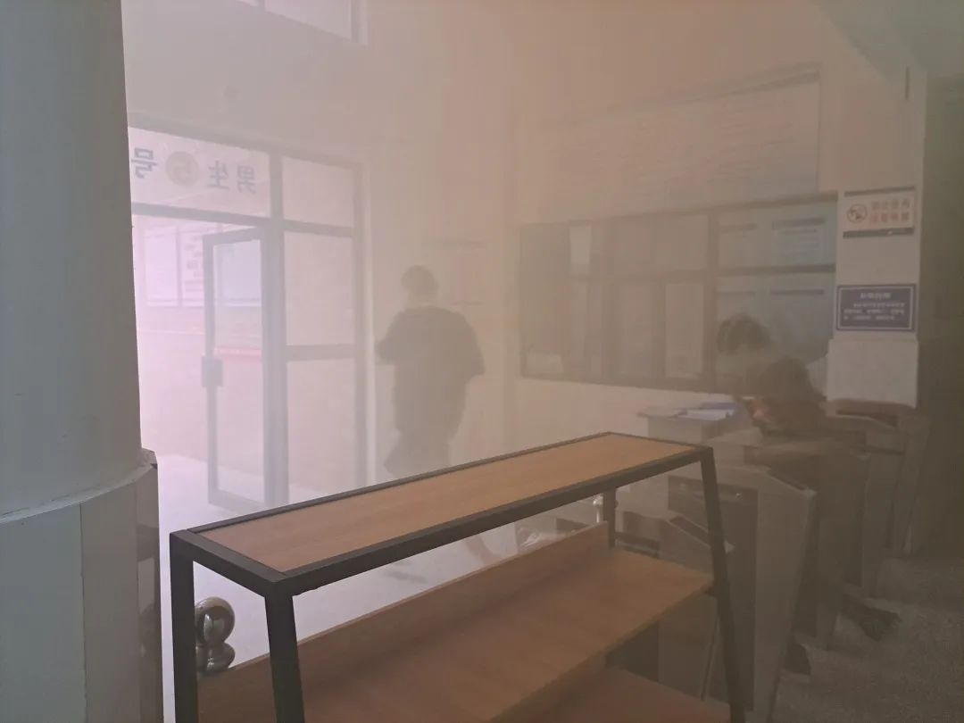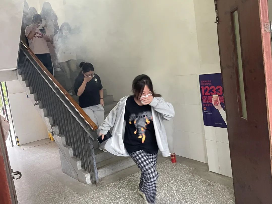 学院通过燃放烟雾弹下达警报,班主任指导学生有秩序地迅速撤离。同学们用手帕或者衣袖等捂住口鼻,猫着腰有序地逃到安全区域,到达指定位置后,各班马上清点人数,向现场指挥汇报。