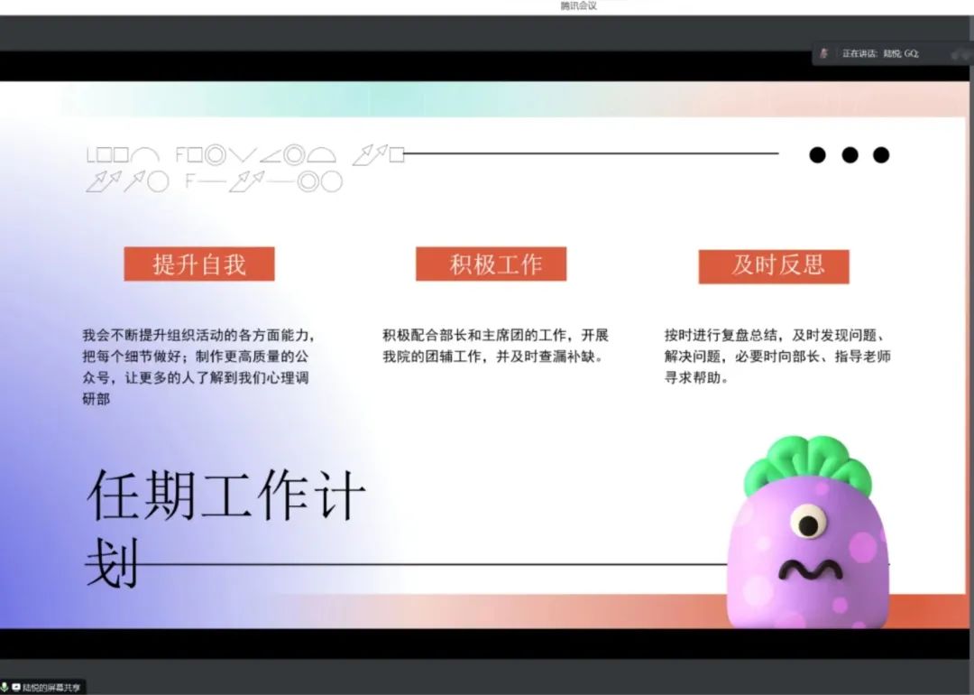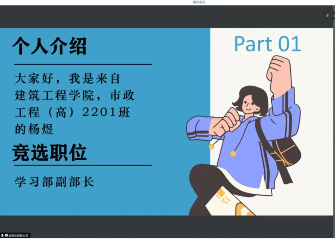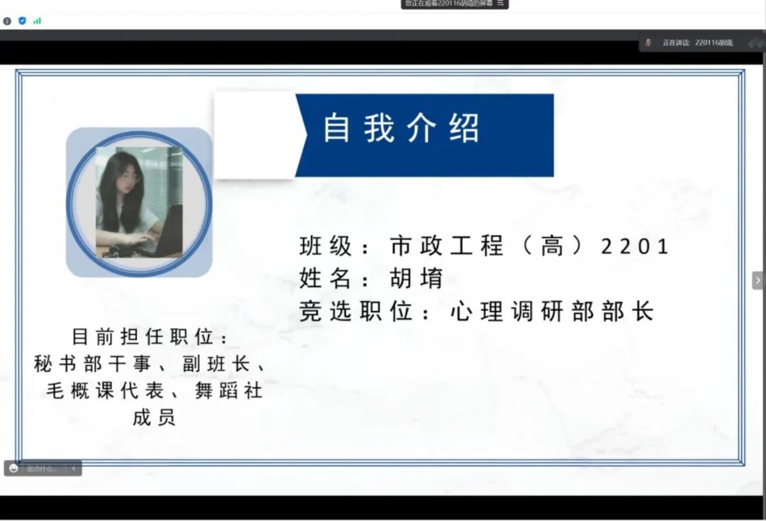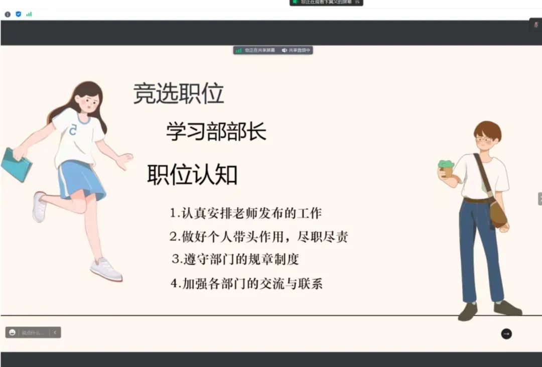 为进一步遴选和培养优秀学生干部,锻炼能力、提升自我,积极创建优良院风。我院于6月29日下午3时开展了学生会干部选拔面试活动,本次活动采用线上会议的形式。参加本次活动的有学院副院长李文飞、团总支书记谷青,学生会主席团以及部门负责人竞选人,会议由谷青书记主持。