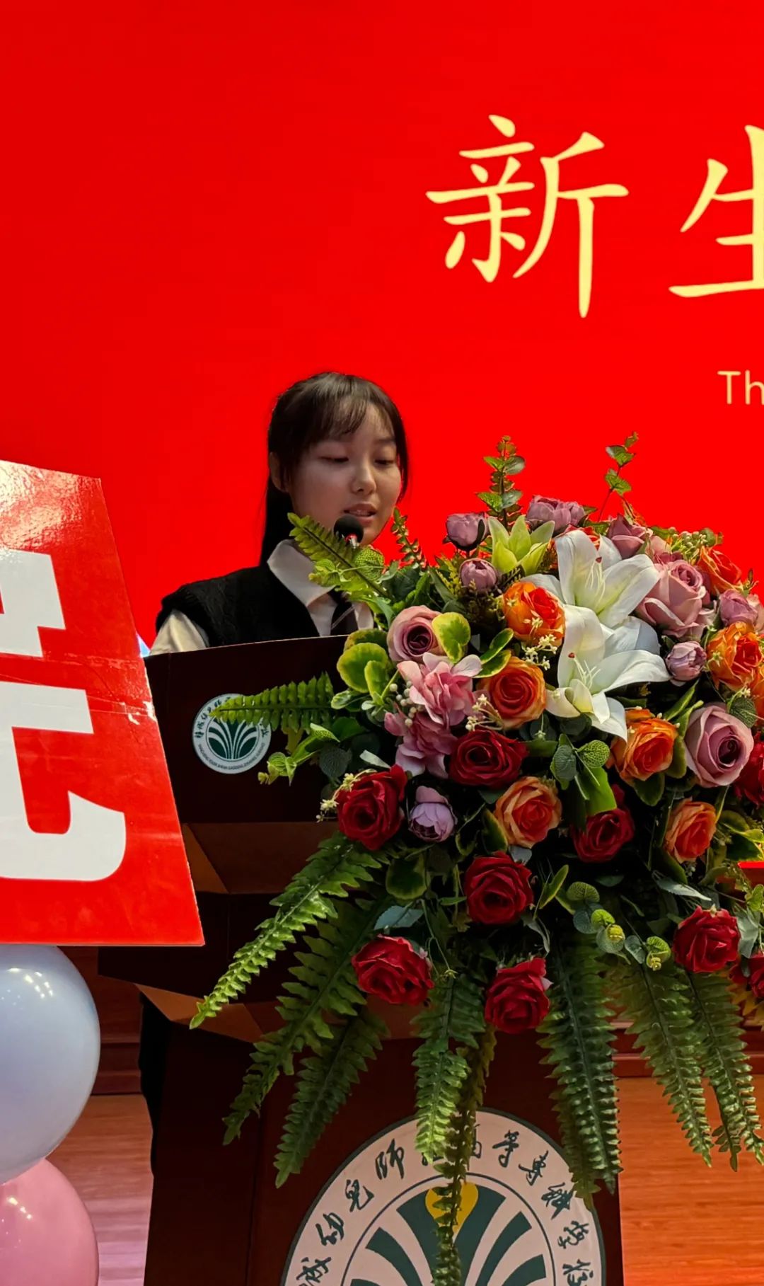 杭泽睿同学作为新生代表发言,她号召同学们做好自我设计、确定目标,在小事中不断积累成长,从而提升自身的专业能力和职业素养,用“天生我材必有用”的满腔自信和“吹尽黄沙始到金”的坚定毅力,去书写“春风得意马蹄疾”的灿烂辉煌!
