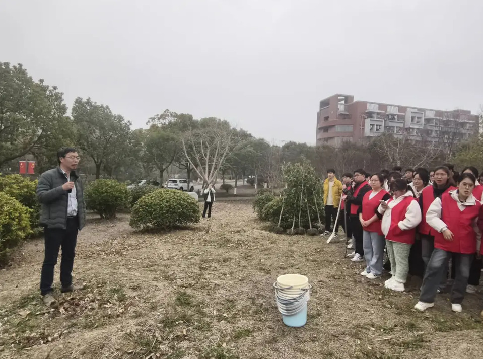 在植树过程中,老师们不仅亲自示范操作,还耐心指导志愿者们如何正确挖坑、扶正树苗、填土夯实以及浇水保湿,确保每一棵树苗都能茁壮成长。钱达友院长特别向同学们讲解了填土后需形成围堰的技巧,以此达到防水与围水的效果,保障树苗的成活率。